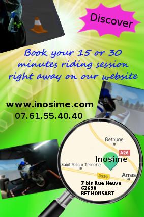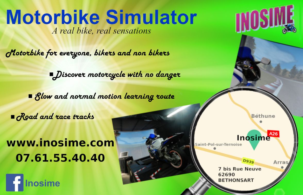 Have Fun on our motorcycle simulator driving a 1000GSXR. This is not a vidéo game ! Ride a motorcycle safely with a choice of several type of ride. 16 and older are welcome. We are located, in the Hauts de France. Please visit our website: www.inosime.com